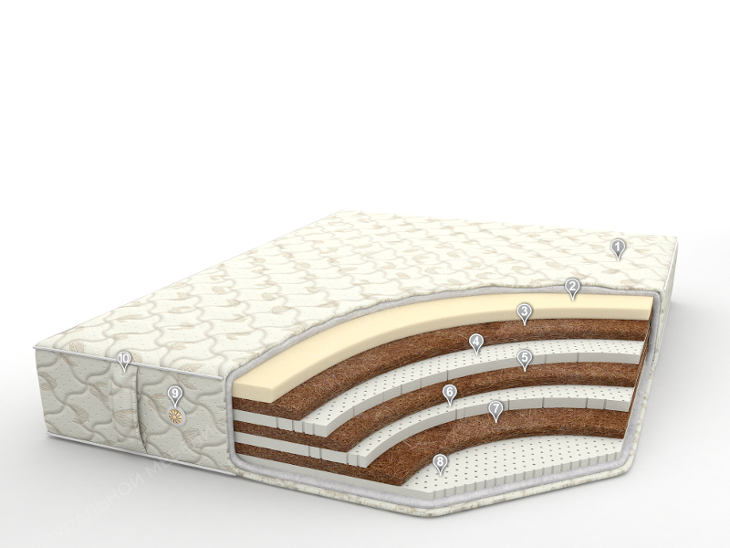• Внутреннее наполнение - мемори форм (40 мм) + кокосовая койра (30 мм) + латекс (30 мм) + кокосовая койра (30 мм) + латекс (30 мм) + кокосовая койра (30 мм) + латекс (30 мм)