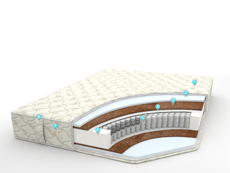 • Внутреннее наполнение - ППУ (20 мм) + кокосовая койра (10 мм) + спанбонд / спанбонд + кокосовая койра (10 мм) + ППУ (20 мм)