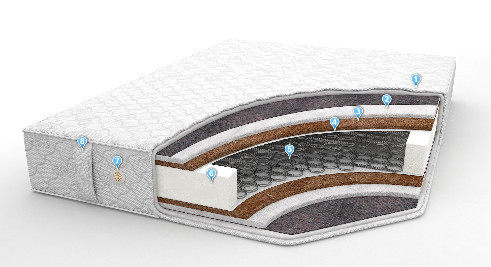 • Внутреннее наполнение - холкон (20 мм) + кокосовая койра (20 мм) + спанбонд / спанбонд + кокосовая койра (20 мм) + холкон (20 мм)