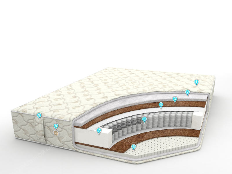 • Внутреннее наполнение - латекс (30 мм) + кокосовая койра (10 мм) + спанбонд / спанбонд + кокосовая койра (10 мм) + холкон (30 мм)