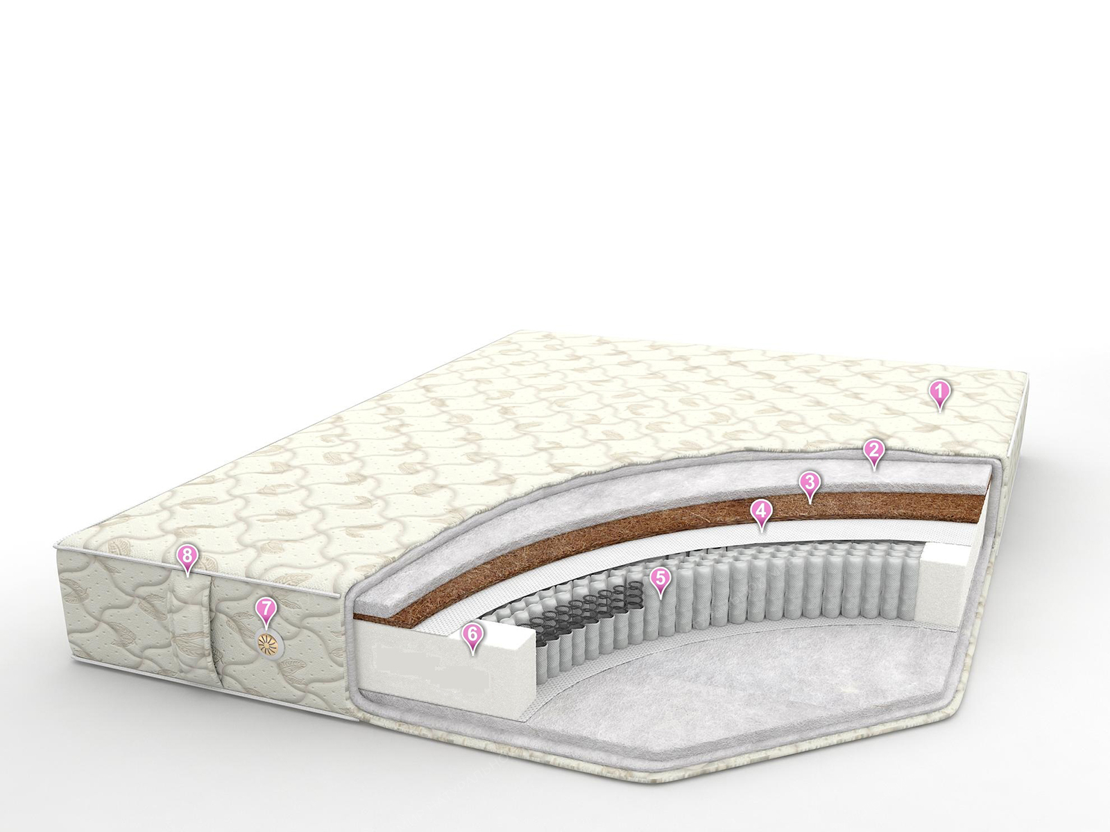 • Внутреннее наполнение - 1 сторона (средней жесткости) - холкон (20 мм) + кокосовая койра (10 мм) + спанбонд / спанбонд + 2 сторона (мягкая) + холкон (20 мм)
