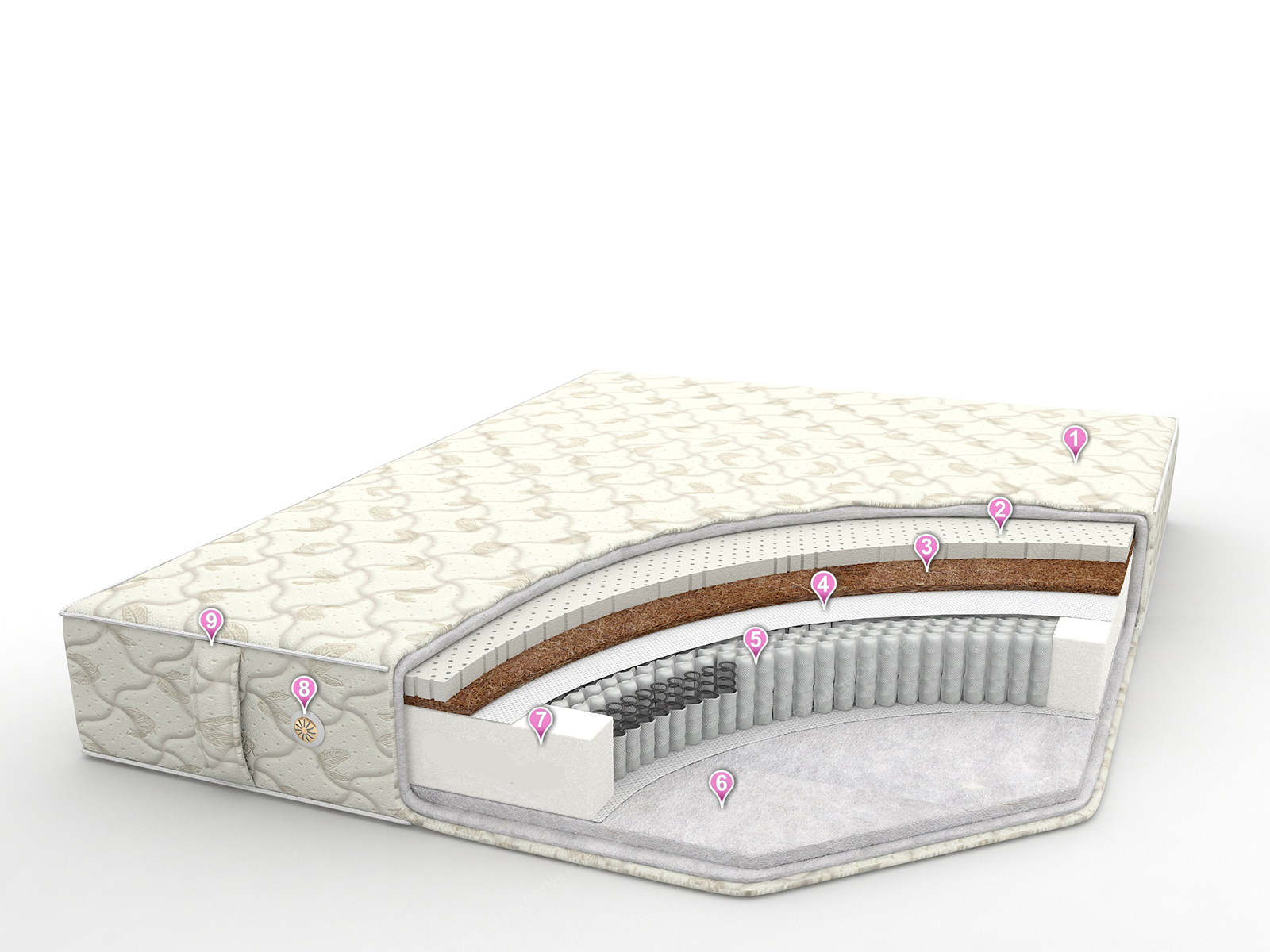 • Внутреннее наполнение - 1 сторона (средней жесткости) - латекс (30 мм) + кокосовая койра (10 мм) + спанбонд (2 слоя) - 2 сторона (мягкая) - холкон (30 мм)