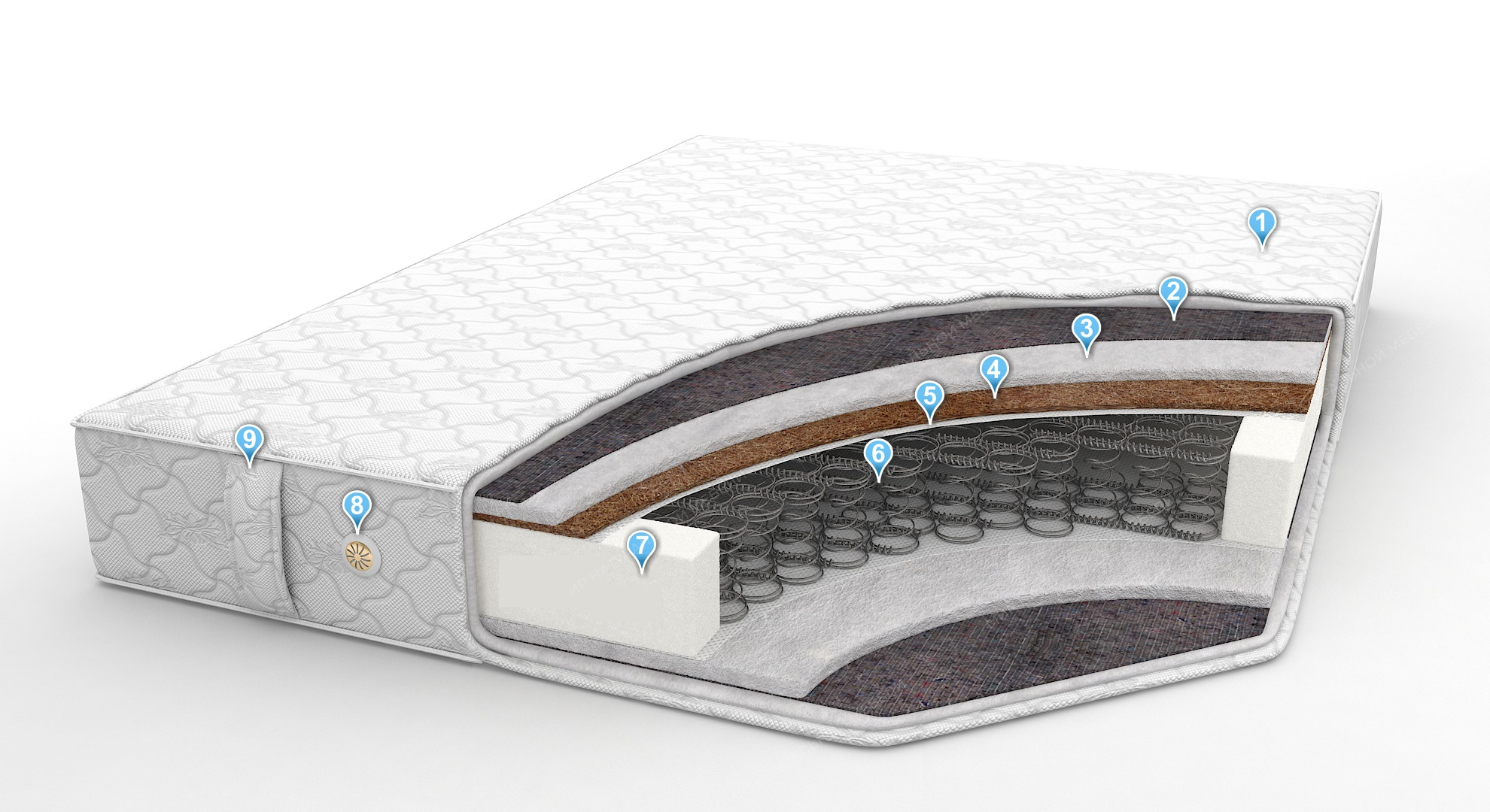 • Внутреннее наполнение - холкон (20 мм) + кокосовая койра (10 мм) + спанбонд / спанбонд + холкон (20 мм)