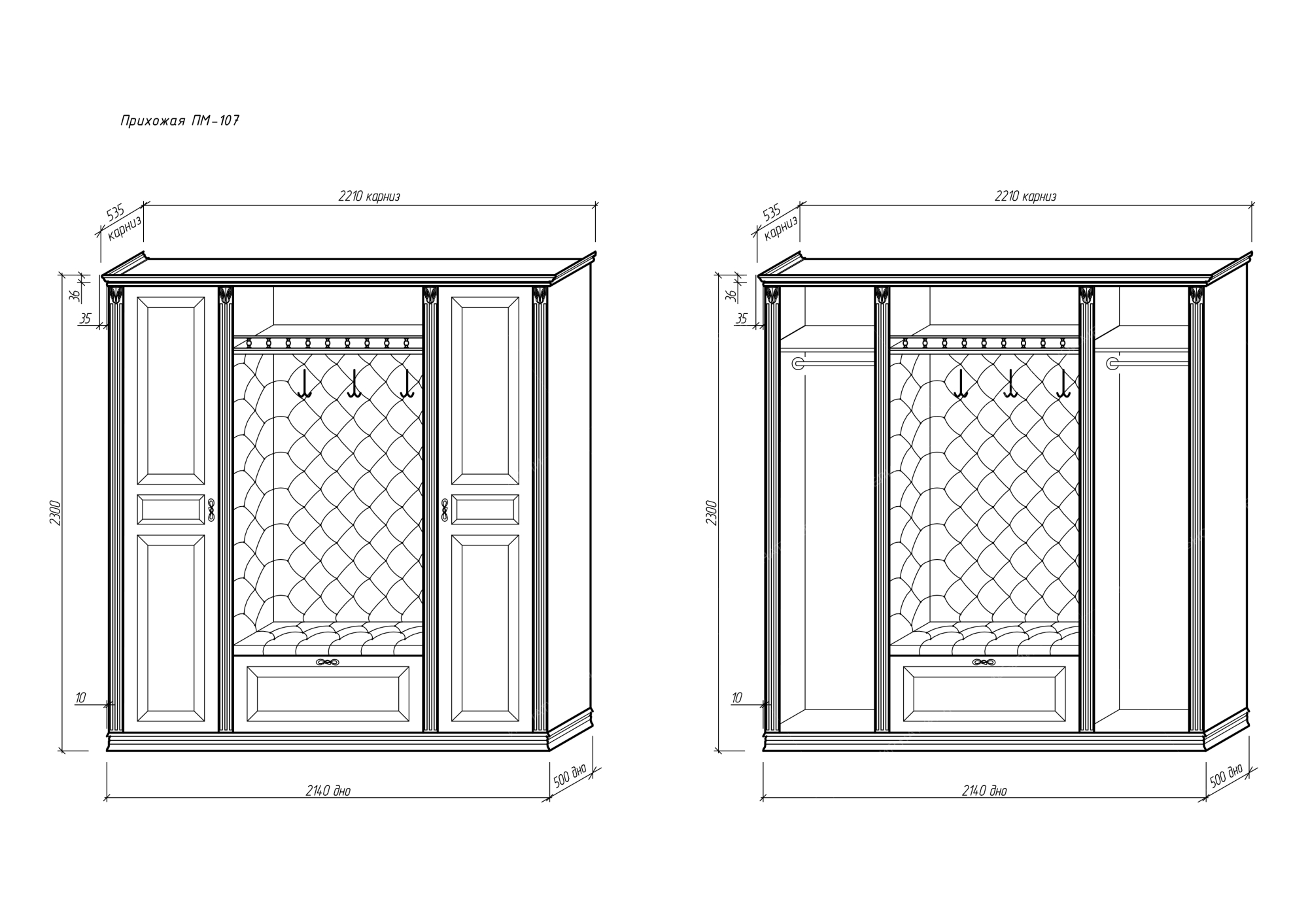 общие габариты изделий коллекции Прихожих ПМ сверху шире указанного размера на 9 см за счет отступа верхнего багета!